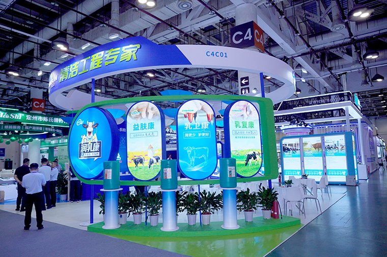 精心打造的展臺(tái),延續(xù)了康臣一貫風(fēng)格。藍(lán)色代表專業(yè)、可靠,白色象征純凈、安全。雨傘的形狀與奶牛乳房類似。代表康臣的使命是用專業(yè)的力量保護(hù)奶牛乳頭健康。