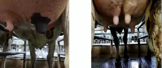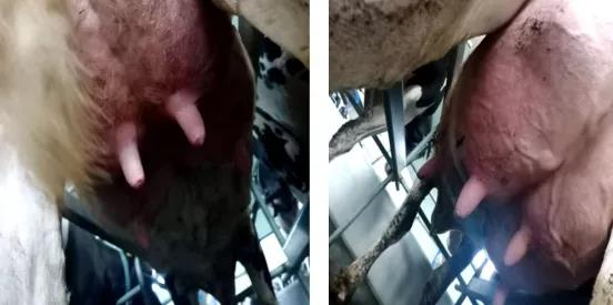 這是該牧場清潔前后乳頭情況的一個對比,可以很清楚地看到,使用小旋風(fēng)乳頭刷后,奶牛乳頭的衛(wèi)生狀況有了很大的改善,同時可以看到乳頭充盈度明顯提高,乳頭皮膚沒有任何損傷。